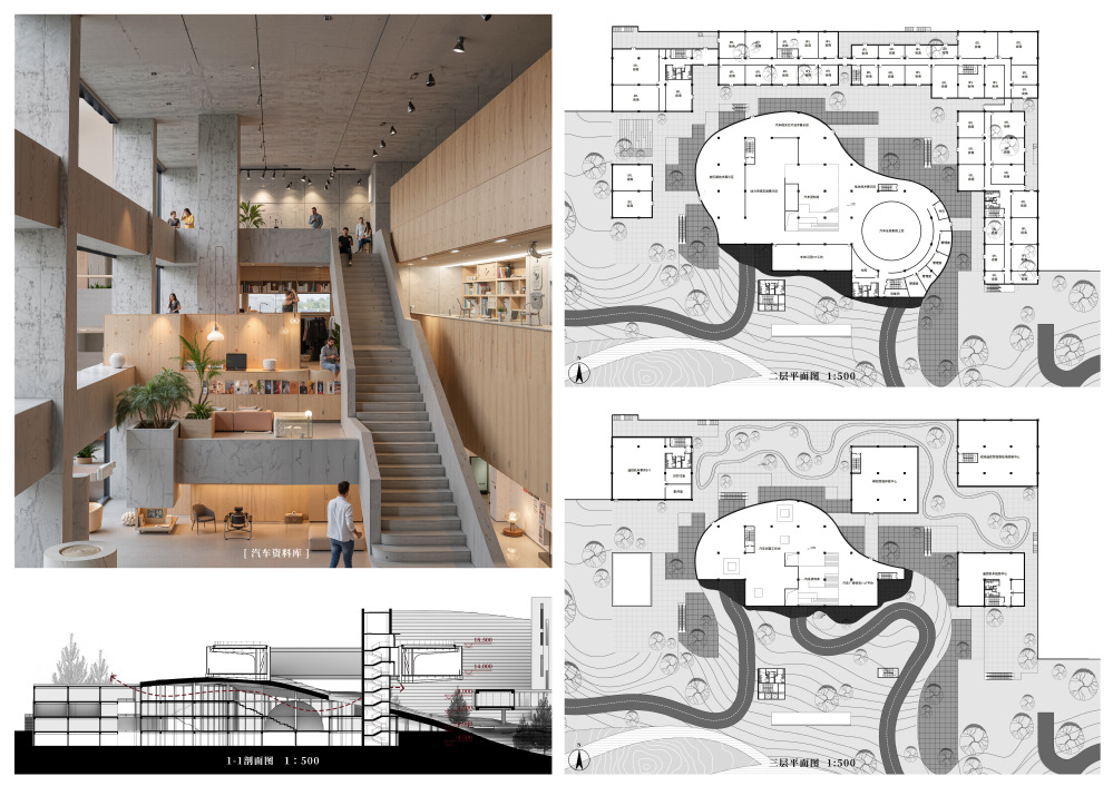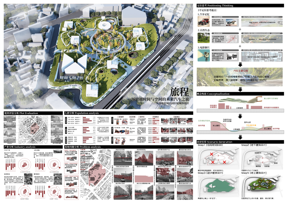 项目基地位于吉林省长春市电影城旧址,依托城市工业文化基因与电影艺术底蕴,旨在打造一座融合汽车工业主题、文化体验与公共生活的新型复合空间。设计以“工业记忆再生”为核心理念,通过覆土建筑形态与架空环廊的立体化空间叙事,回应长春汽车工业发展历程,屋顶覆土坡道与景观自然衔接,形成生态史与电影文化特色:建筑主体采用覆土形势呼应园区步道系统,下方形成公共广场,顶部覆土界面兼具节能效益;首层抬升的环形架空廊道与车道无缝对接园区交通,实现人车分流。功能布局上,沿街以退台层叠的商业体块延续城市生活服务,植入文创、餐饮等业态激活片区活力;内部纵向分区涵盖汽车服务工艺展示、创客空间等功能,并通过天窗体系与风廊组织优化光环境与通风效率。建筑以锈蚀钢板、玻璃幕墙与钢结构演绎工业美学,保留齿轮雕塑等遗迹形成“记忆长廊”,最终构建一处缝合城市肌理、对话历史与未来的文化地标。